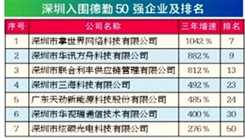 頒獎典禮在深圳舉行。深圳地區有7家企業上榜,華訊方舟位列第9,其三年增長率高達882%。